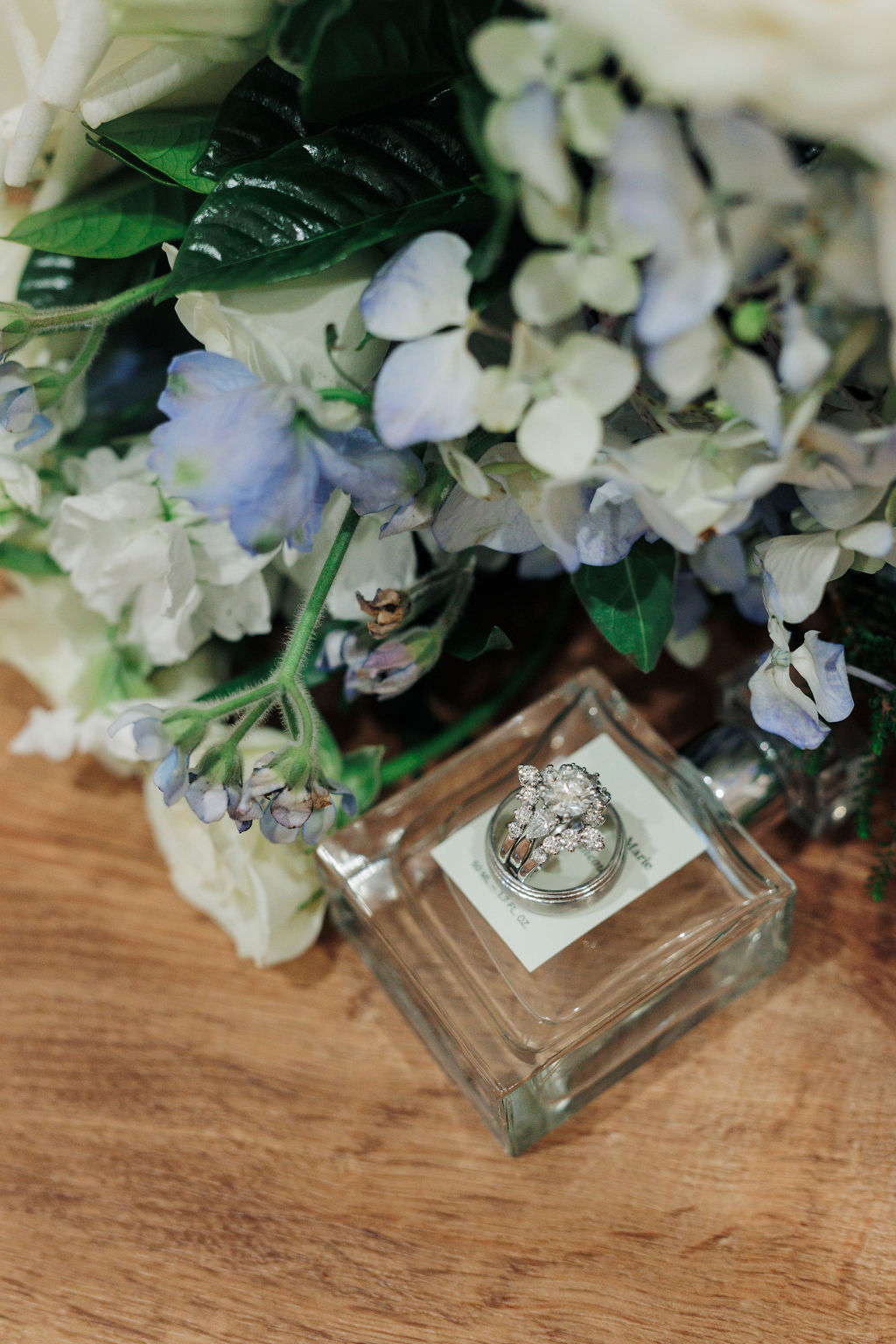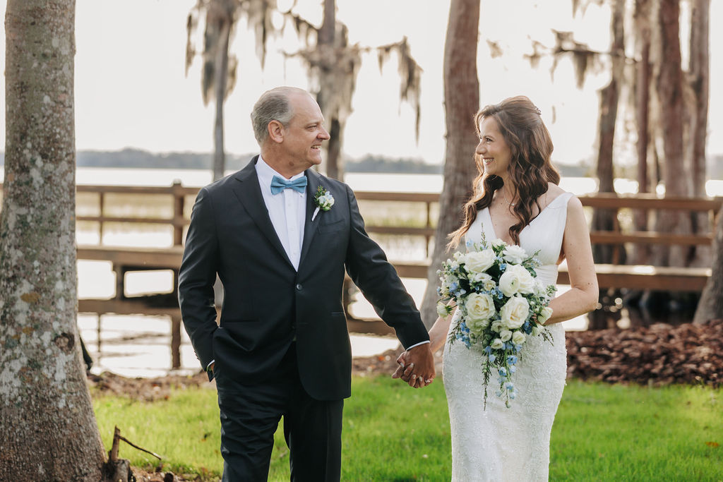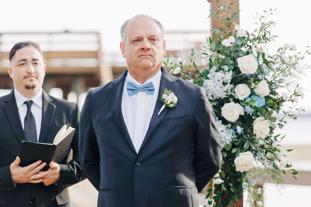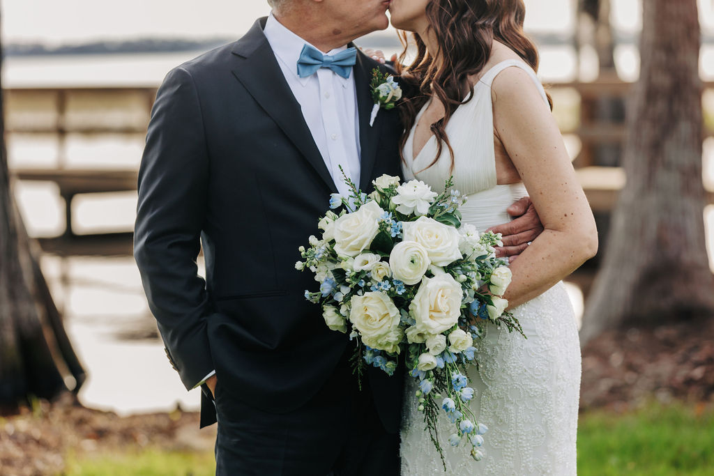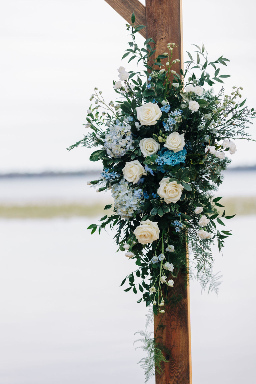 The floral palette focused on white and ivory blooms, layered with soft blue accents and seasonal greenery. Designs were intentionally airy, allowing movement, texture, and negative space to guide the overall composition. A wooden ceremony arbor was styled with asymmetrical floral placements to frame the ceremony while preserving open views of the lake beyond. Bridal and personal flowers echoed the same loose, natural structure to create visual continuity throughout the day.