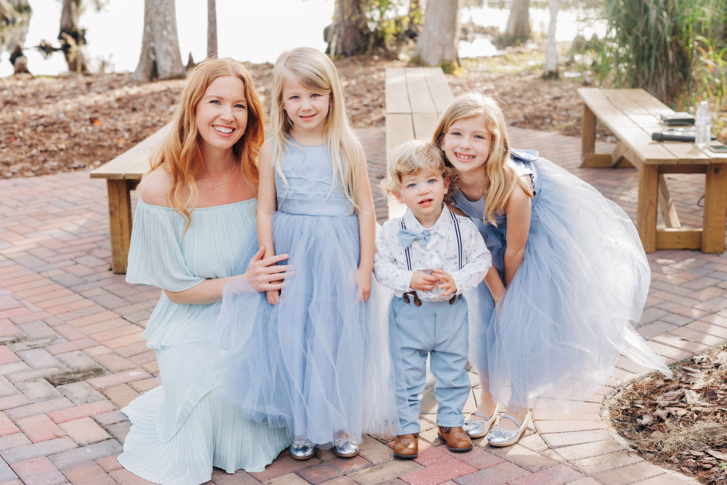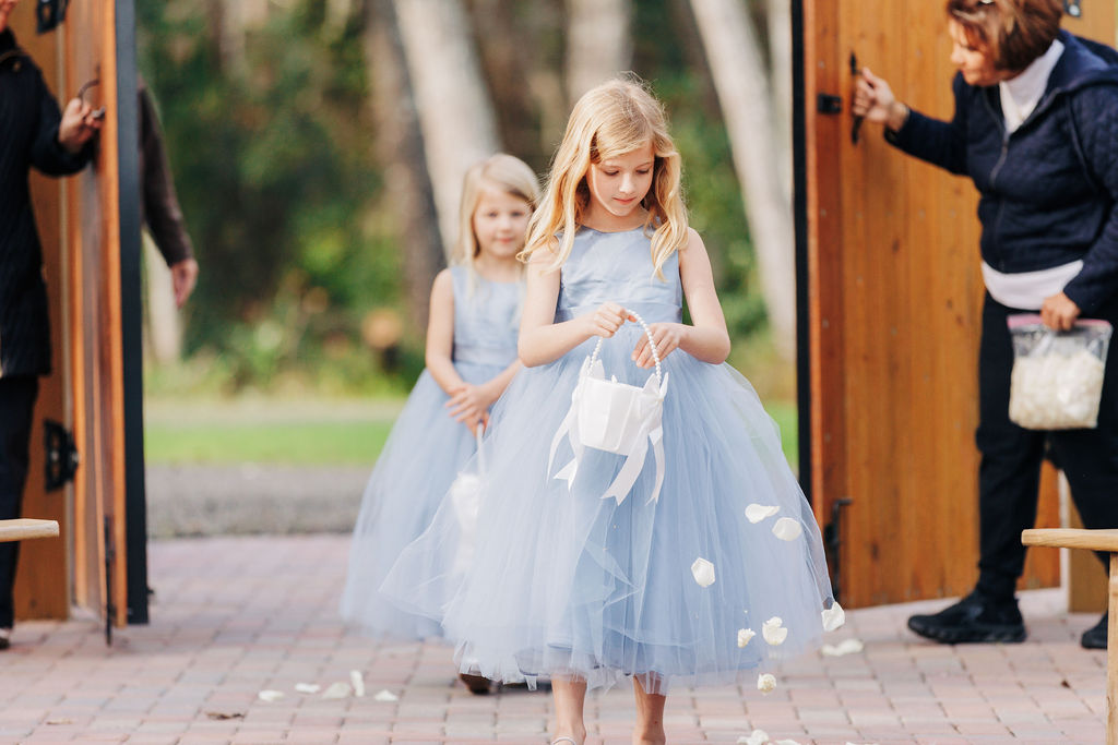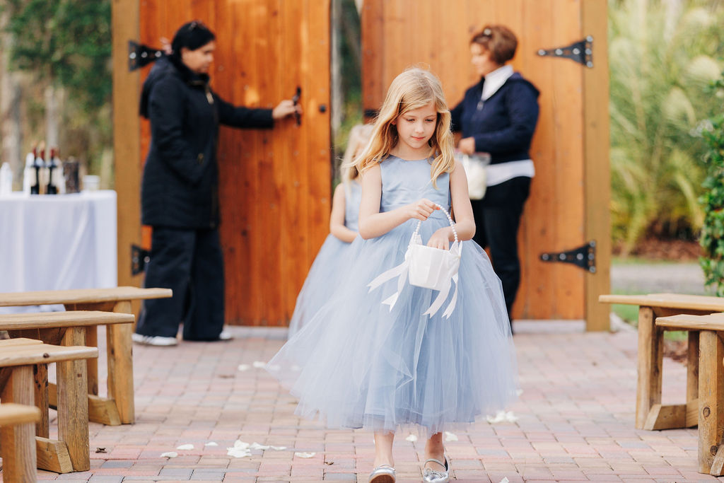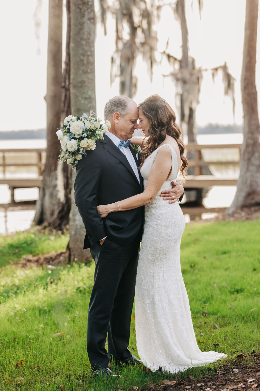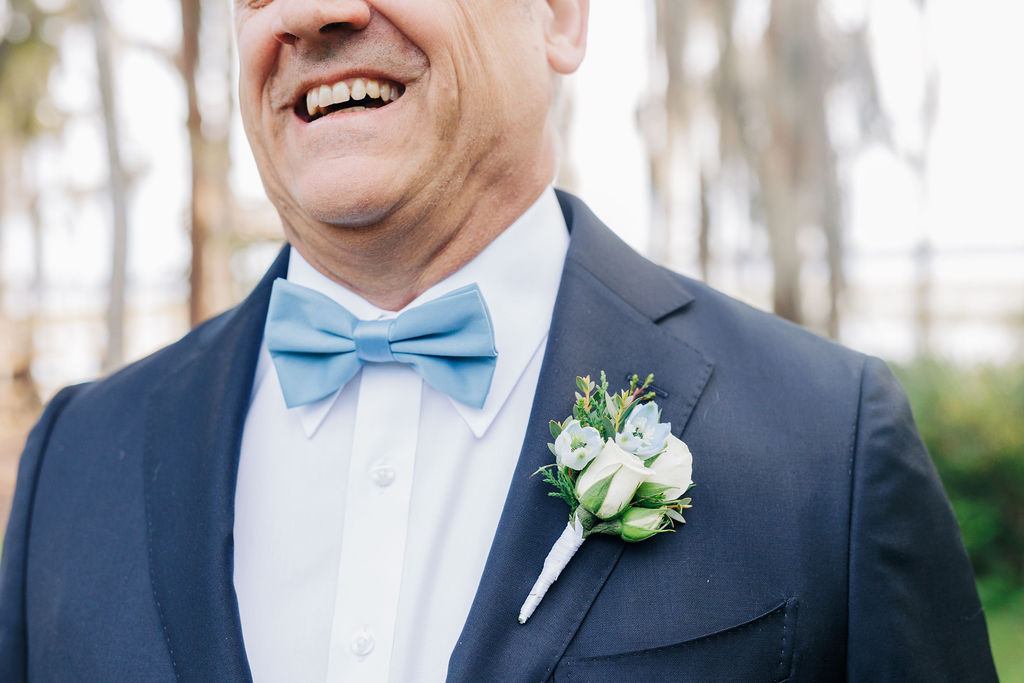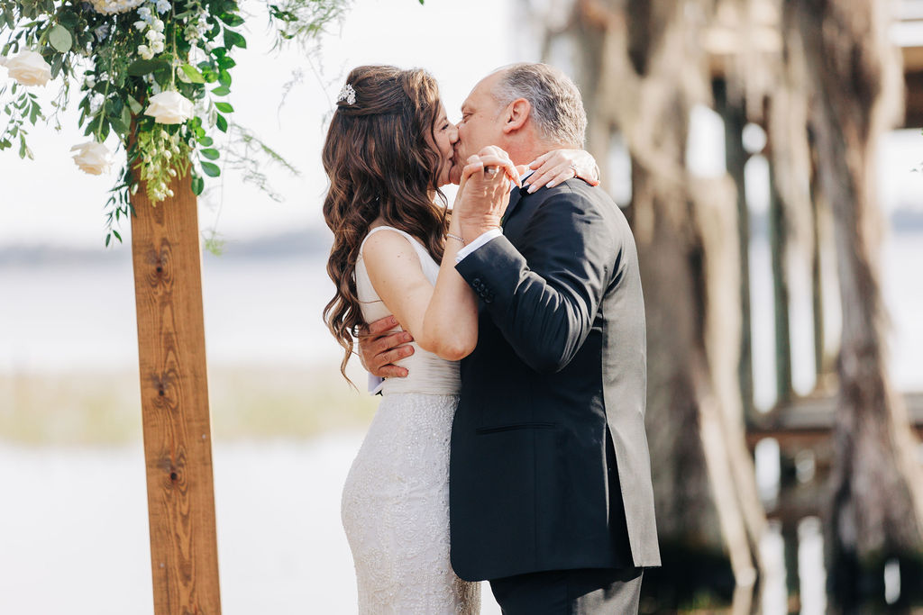 The floral palette focused on white and ivory blooms, layered with soft blue accents and seasonal greenery. Designs were intentionally airy, allowing movement, texture, and negative space to guide the overall composition. A wooden ceremony arbor was styled with asymmetrical floral placements to frame the ceremony while preserving open views of the lake beyond. Bridal and personal flowers echoed the same loose, natural structure to create visual continuity throughout the day.
