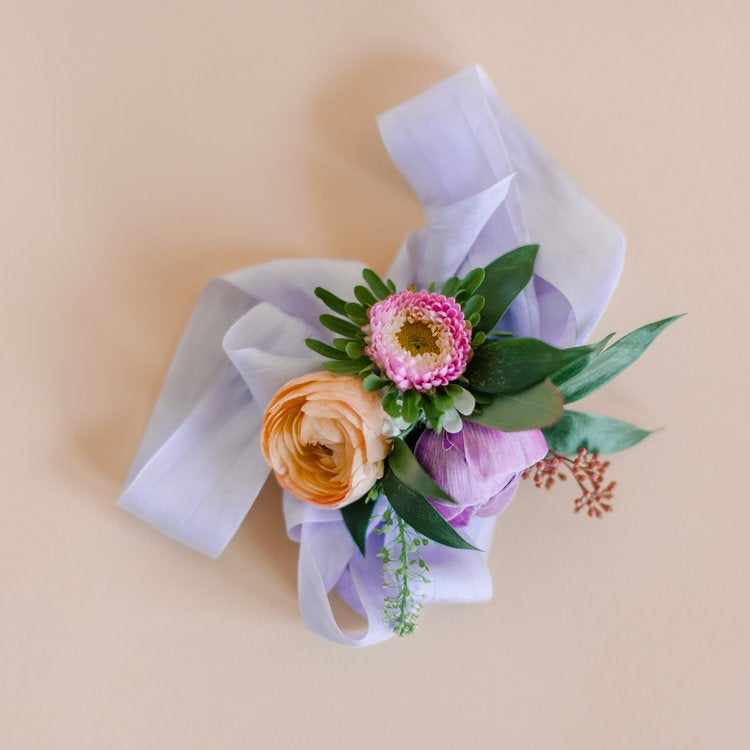 A refined wrist corsage designed with a delicate balance of premium seasonal blooms and soft textural accents. This piece features a curated selection of flowers such as spray roses, ranunculus, and other in season blooms arranged in a compact, elegant composition with natural movement. Finished on a comfortable, modern wristlet for a polished and secure fit.