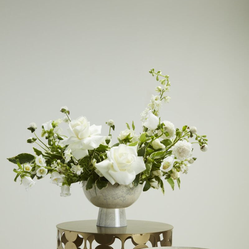 Crisp white roses take center stage, chosen for their architectural form and timeless appeal. Delicate greenery and graceful line work soften the composition, creating a balanced silhouette that feels polished yet organic. Styled in a modern marbled vessel, Sweet Margot offers a composed, luminous presence, refined enough for modern interiors, understated celebrations, and discerning recipients who value thoughtful design over excess.