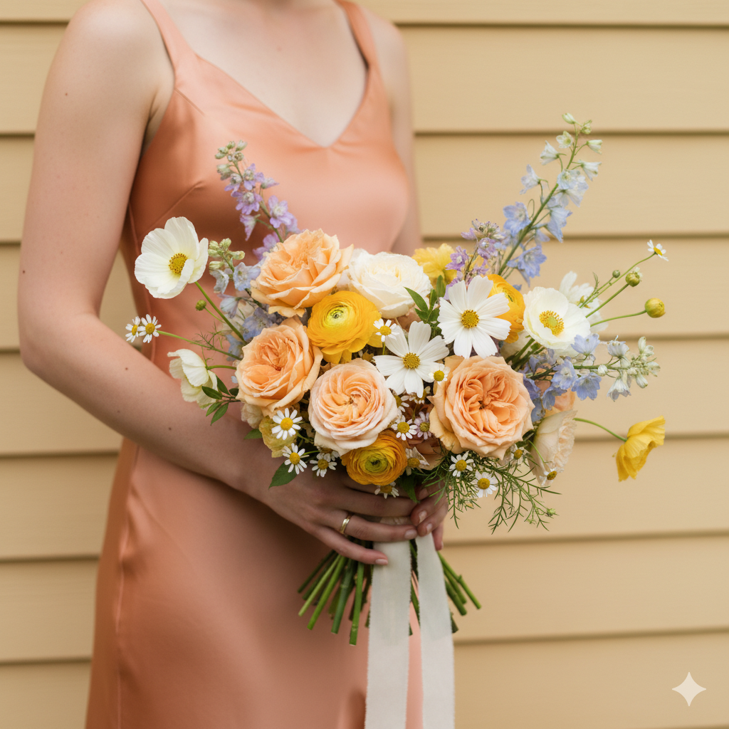 Our designers curate a seasonal blend of premium blooms—such as roses, ranunculus, lisianthus, spray roses, or similar garden florals, layered with delicate textural accents and thoughtfully selected greenery. The result is an airy, organic composition that photographs beautifully and feels effortless in hand.